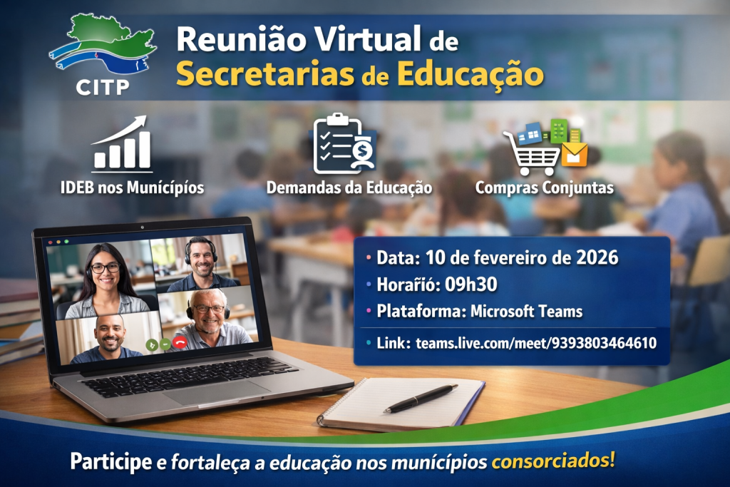 O Consórcio Intermunicipal dos Vales dos Rios Tietê-Paraná (CITP) promoverá, no dia 10 de fevereiro de 2026, às 9h30, uma importante reunião virtual de trabalho com os(as) Secretários(as) Municipais de Educação dos municípios consorciados. O encontro será realizado por meio da plataforma Microsoft Teams. A pauta do encontro incluirá temas fundamentais para o avanço da educação regional, como a análise do IDEB nos municípios integrantes do consórcio, o levantamento e discussão de demandas da área educacional e a avaliação de oportunidades para compras conjuntas entre as cidades participantes. O CITP reforça a relevância da presença não apenas dos Secretários(as) Municipais de Educação, mas também de Diretores Municipais e equipes técnicas da área, visando o fortalecimento da gestão educacional integrada e colaborativa entre os municípios consorciados.