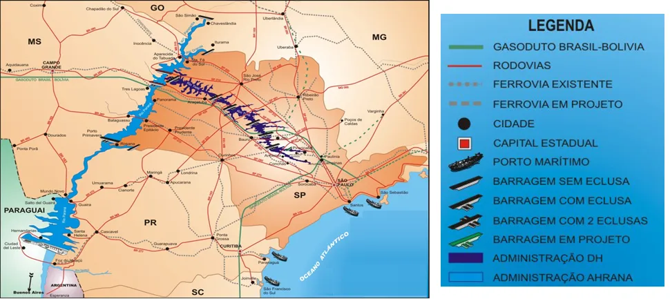 Nos últimos 50 anos, o Governo do Estado de São Paulo promoveu, nos rios Tietê e Paraná, a implantação de barragens equipadas com eclusas para permitir as embarcações vencerem os desníveis provocados pelos aproveitamentos energéticos. Conjuntamente efetuou a abertura de canais para melhoria das condições de navegação e sinalização da rota de navegação de todo o trecho. Consolidou, dessa forma, um sistema de transporte hidroviário interligado às malhas rodoviária e ferroviária. A Hidrovia Tietê-Paraná integra, portanto, um grande sistema de transporte multimodal, apresentando-se como alternativa de corredor de exportação – abrangendo os Estados de São Paulo, Paraná, Mato Grosso do Sul, Goiás e Minas Gerais, uma região de 76 milhões de hectares, onde é gerada quase a metade do produto interno brasileiro – conectando áreas de produção aos portos marítimos, e no sentido do interior, servindo os principais centros do Mercosul. Esse sistema hidroviário é administrado, no rio Tietê, pelo Departamento Hidroviário (DH), da Secretaria dos Transportes do Estado de São Paulo, e, no rio Paraná, pela Administração da Hidrovia do Paraná (AHRANA) (www.ahrana.gov.br), vinculada ao Ministério dos Transportes.